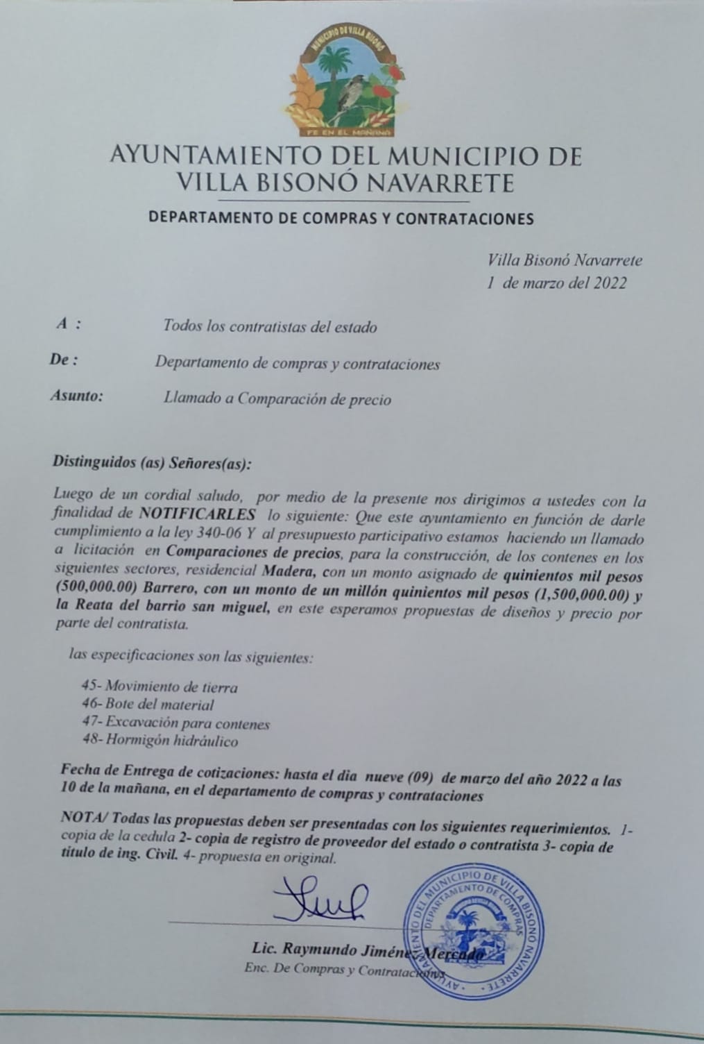 AMVB-CCC-CP-2026-0001COMPARACION DE PRECIOS COMPRA CARRO FUNEBRE-2024 Comparación de Precio Descargar 1.33MB Fecha de subida: 8 febrero, 2024 CONVOCATORIA A COMPARACION DE PRECIO Descargar 680.29KB Fecha de subida: 9 mayo, 2023 compracion de precio 3 camiones Descargar 259.36KB Fecha de subida: 24 febrero, 2023 Comparacion de precio camiones029 Descargar 517.63KB Fecha de subida: 7 febrero, 2023 solicitud maxima autoridad Descargar 444.89KB Fecha de subida: 13 julio, 2022 solicitud de compra Descargar 488.62KB Fecha de subida: 13 julio, 2022 SNCC_F047_Autorizacion_Fabricante Descargar 127.35KB Fecha de subida: 13 julio, 2022 SNCC_F042_Informacion_Oferente Descargar 114.89KB Fecha de subida: 13 julio, 2022 SNCC_F034_Presentacion_de_Oferta Descargar 106.89KB Fecha de subida: 13 julio, 2022 SNCC_F033_Of_Economica Descargar 107.47KB Fecha de subida: 13 julio, 2022 SNCC_C023 Contrato Suministro de_Bienes Descargar 70.27KB Fecha de subida: 13 julio, 2022 Pliego camion Descargar 915.79KB Fecha de subida: 13 julio, 2022 ficha técnica Descargar 261.04KB Fecha de subida: 13 julio, 2022 dictamen juridico Descargar 612.25KB Fecha de subida: 13 julio, 2022 apropiación de fondos Descargar 554.60KB Fecha de subida: 13 julio, 2022 acto administrativo que da inicio al proceso Descargar 6.17MB Fecha de subida: 13 julio, 2022 COMPARACIÓN DE PRECIO Descargar 182.20KB Fecha de subida: 17 junio, 2022 LLAMADO A COMPARACIÓN DE PRECIO. Descargar 123.68KB Fecha de subida: 17 mayo, 2022 LLAMADO A LICITACION. Descargar 1.07MB Fecha de subida: 17 mayo, 2022 LLAMADO A COMPARACION DE PRECIO Descargar 355.09KB Fecha de subida: 28 abril, 2022 LLAMADO A COMPARACION DE PRECIO Descargar 63.14KB Fecha de subida: 28 abril, 2022 LLAMADO A COMPARACION DE PRECIO a Descargar 63.53KB Fecha de subida: 28 abril, 2022 LLAMADO A COMPARACION DE PRECIO Descargar 65.20KB Fecha de subida: 28 abril, 2022 COMPARACION DE PRECIOS Descargar 104.95KB Fecha de subida: 2 marzo, 2022 COMPARACION DE PRECIO Descargar 188.69KB Fecha de subida: 7 enero, 2022 COMPARACION DE PRECIO. Descargar 205.37KB Fecha de subida: 7 enero, 2022 Efecto Comparacion de precios. Descargar 85.85KB Fecha de subida: 12 noviembre, 2021 Comparaciones de precios Descargar 96.82KB Fecha de subida: 26 octubre, 2021 comparacion de precio contenes Descargar 241.37KB Fecha de subida: 22 septiembre, 2021 todos los contratista del estado Descargar 240.98KB Fecha de subida: 24 agosto, 2021 Comparación de precio -contenes barrio san jose presupuesto participativo Descargar 210.55KB Fecha de subida: 19 julio, 2021 Notificacion de adjudicacion de proceso AMVBN-CCC-CP-2021C Descargar 197.89KB Fecha de subida: 8 julio, 2021 Proceso de Licitacion Camion Compactador Descargar 7.80MB Fecha de subida: 15 junio, 2021